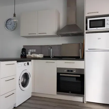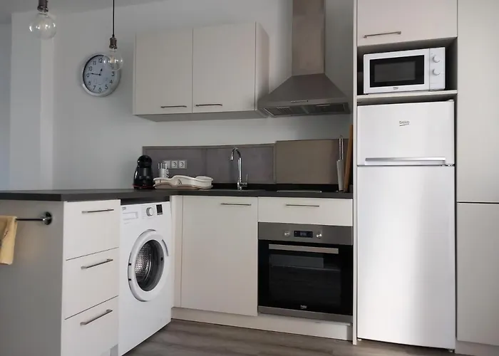 El apartamento dispone de una cocina completa con horno de microondas, nevera y utensilios de cocina.